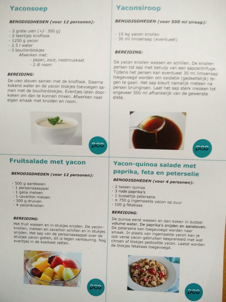 Maak de yacon schoon door sterk te wrijven met een vochtige doek, dunschillen kan ook. Snij de yacon knollen in schijfjes van 0,5 tot 1cm dik. Roerbak de schijfjes in boter+olijfolie goudbruin, kruiden met peper en zout.